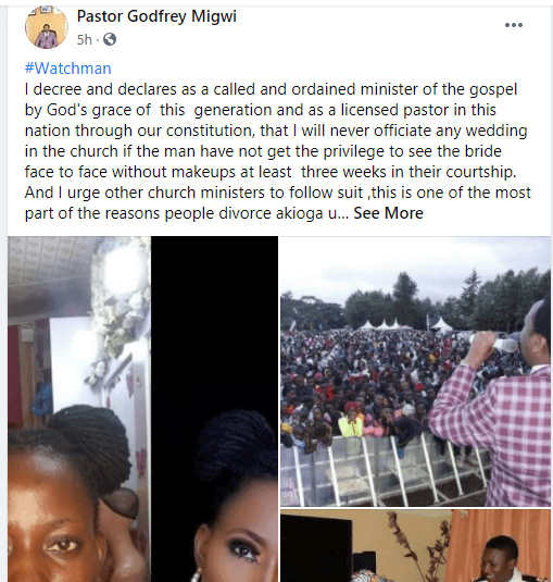 Le pasteur kényan Godfrey Migwi a révélé qu’il n’officiera jamais un mariage si le futur époux n’a pas vu le visage de sa femme sans maquillage.