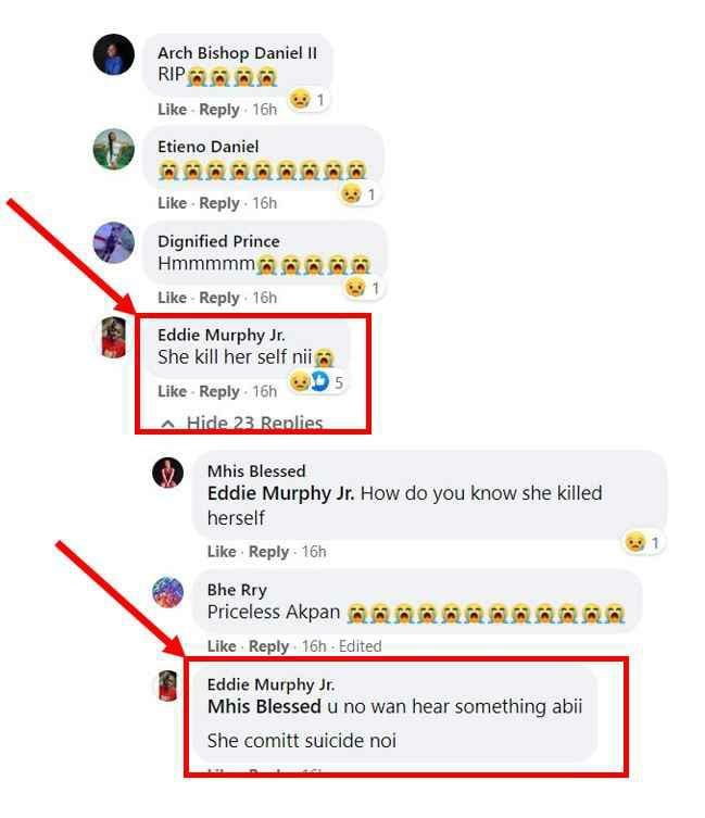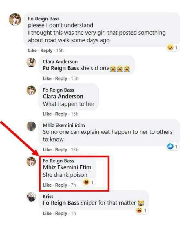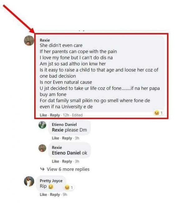 Ses amis se sont rendus sur leurs pages de médias sociaux pour pleurer et lui rendre leur dernier respect. Les informations glanées dans les réactions ont révélé qu’elle s’était suicidée pour avoir perdu son téléphone.